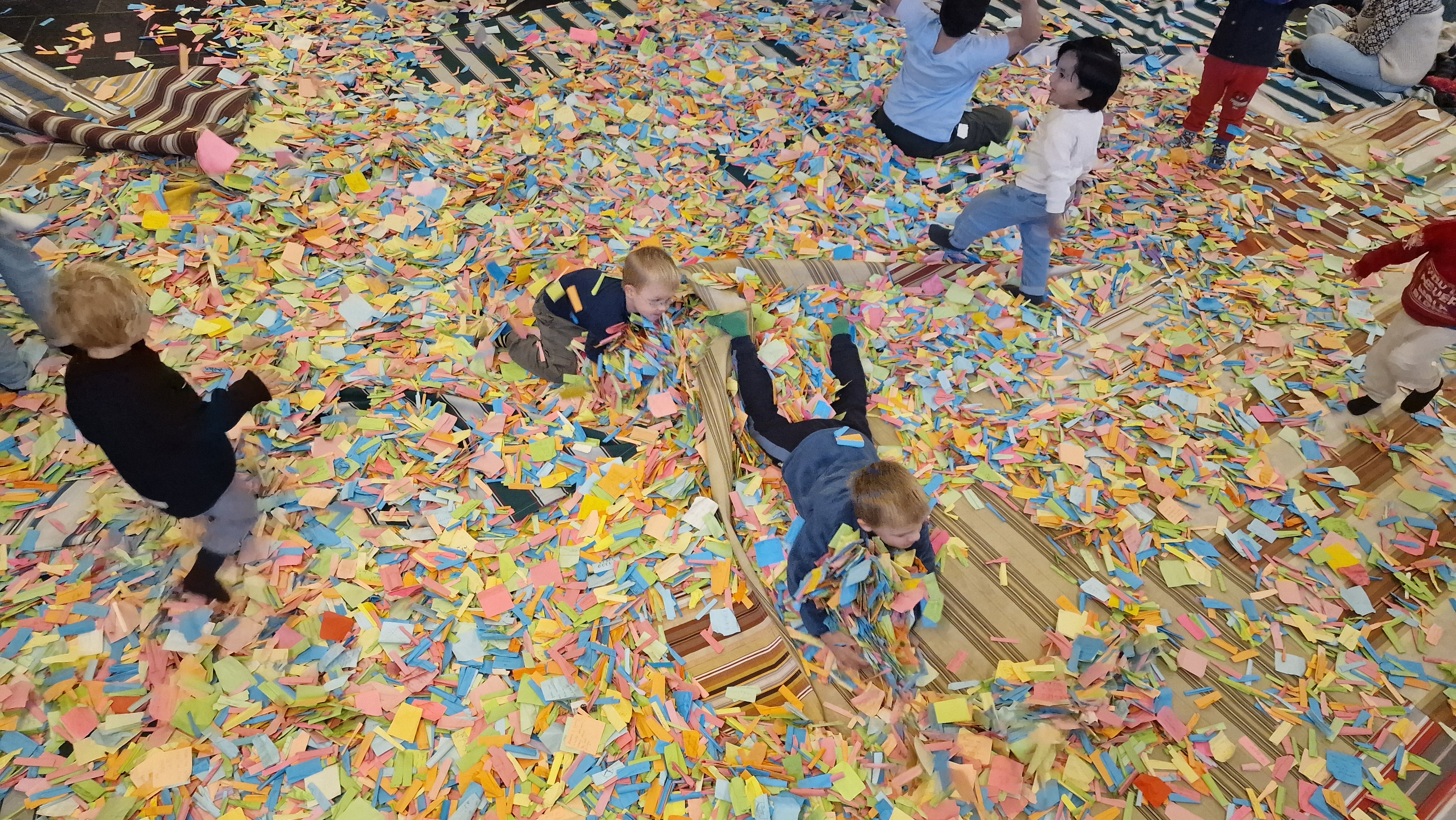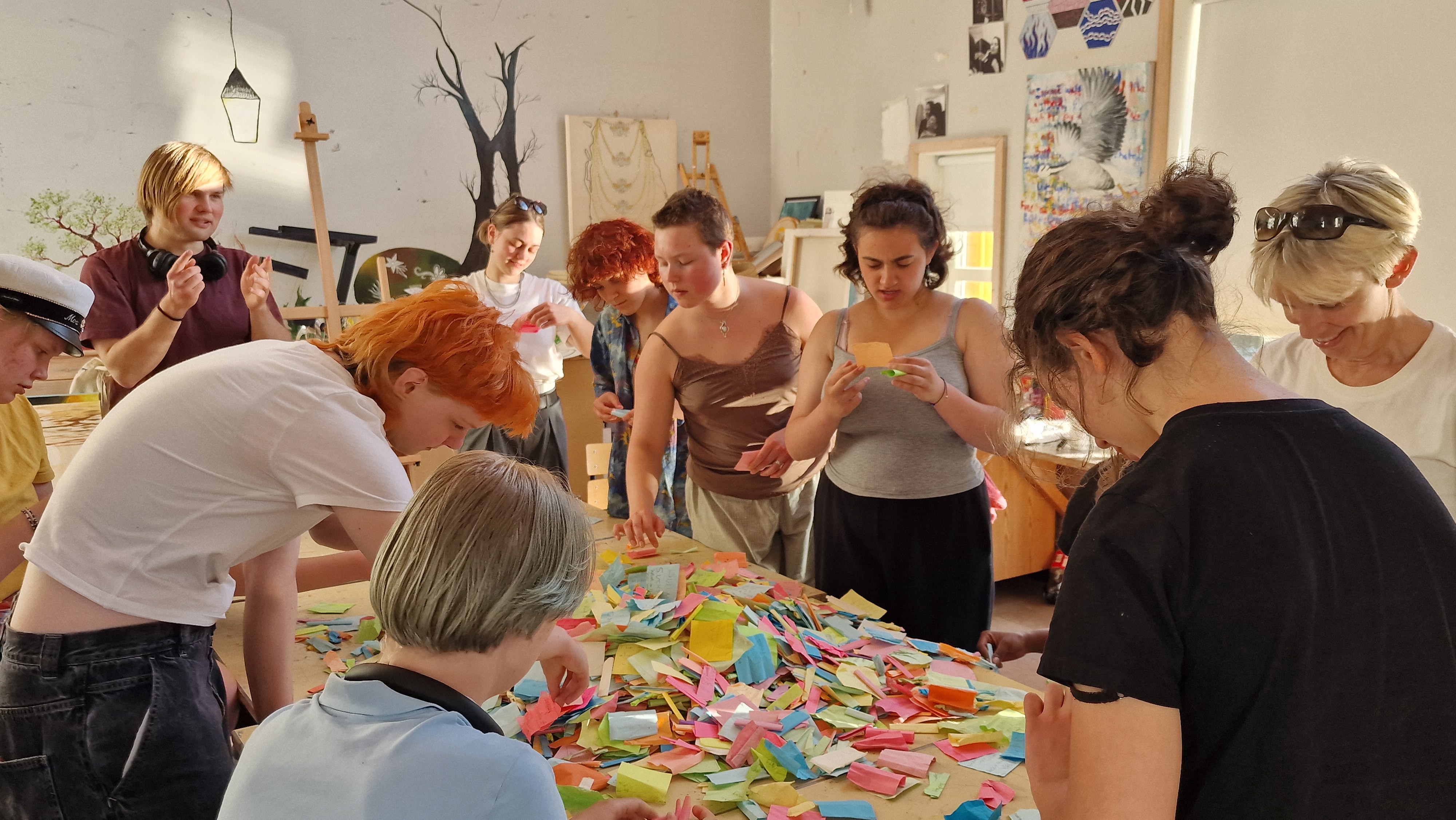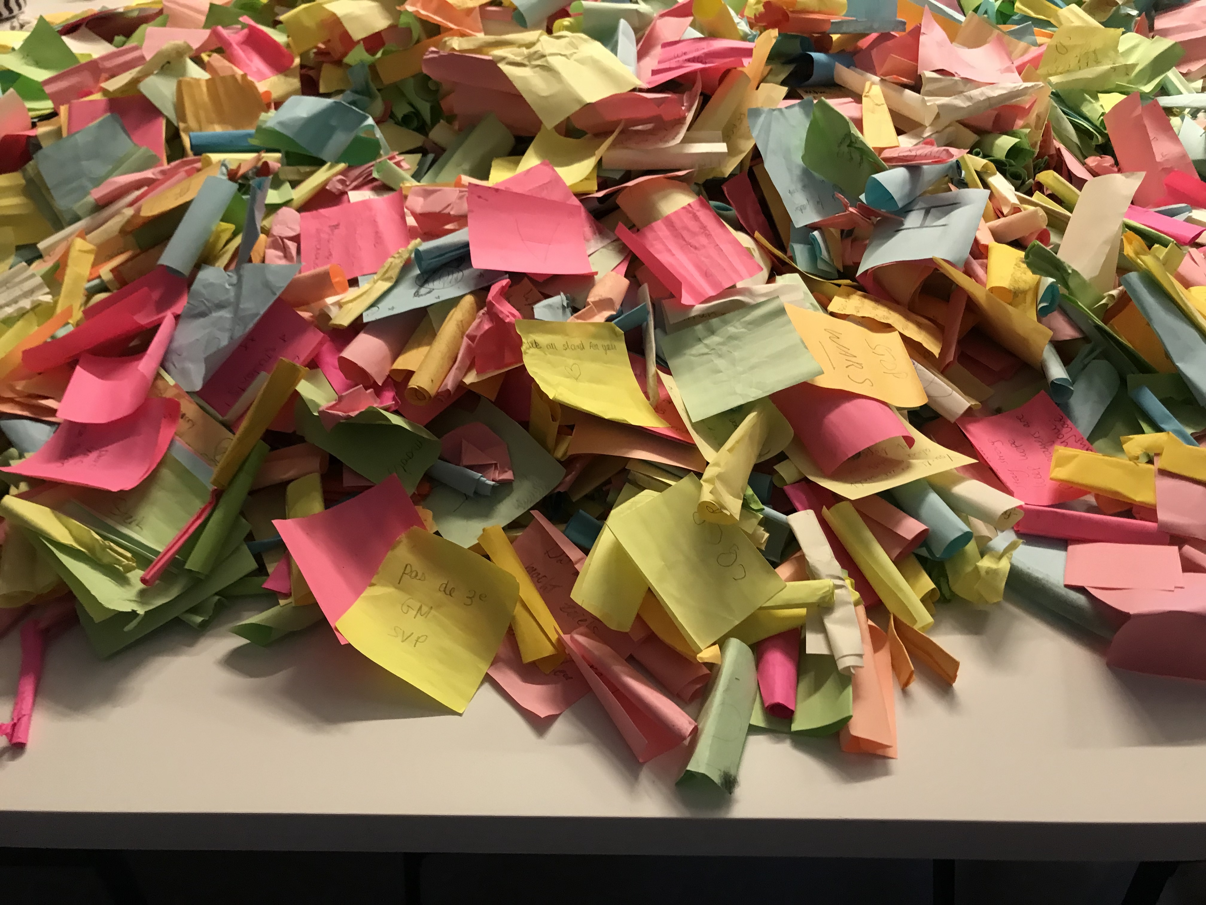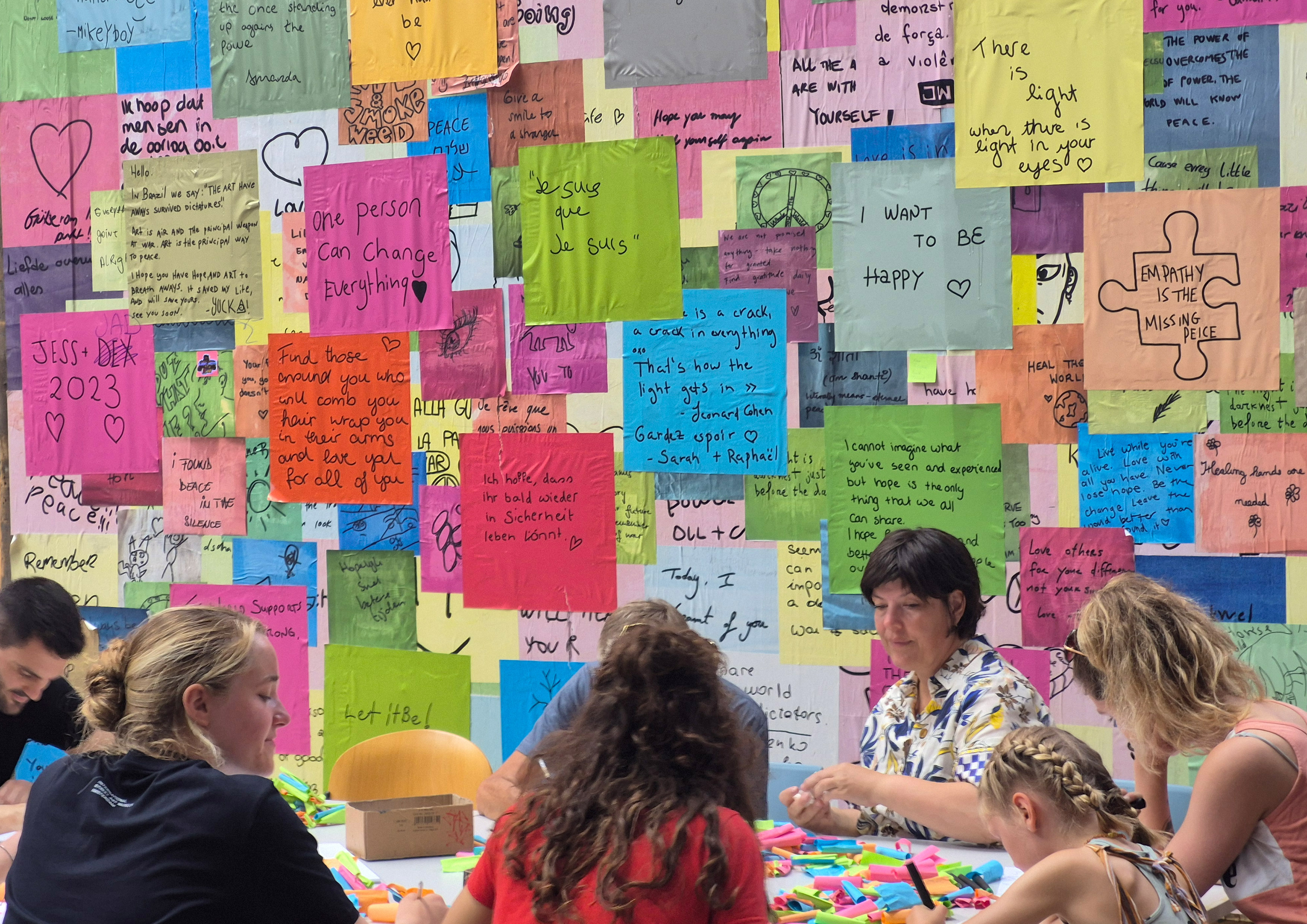 Through the holes left by explosions and bullets, the audience is invited to leave messages of hope and healing on colourful post-it notes, for people suffering from the consequences of wars all over the world. The messages received through the Care Portal are routinely collected and sent to the artist’s studio residency, and these notes form the basis of workshops.